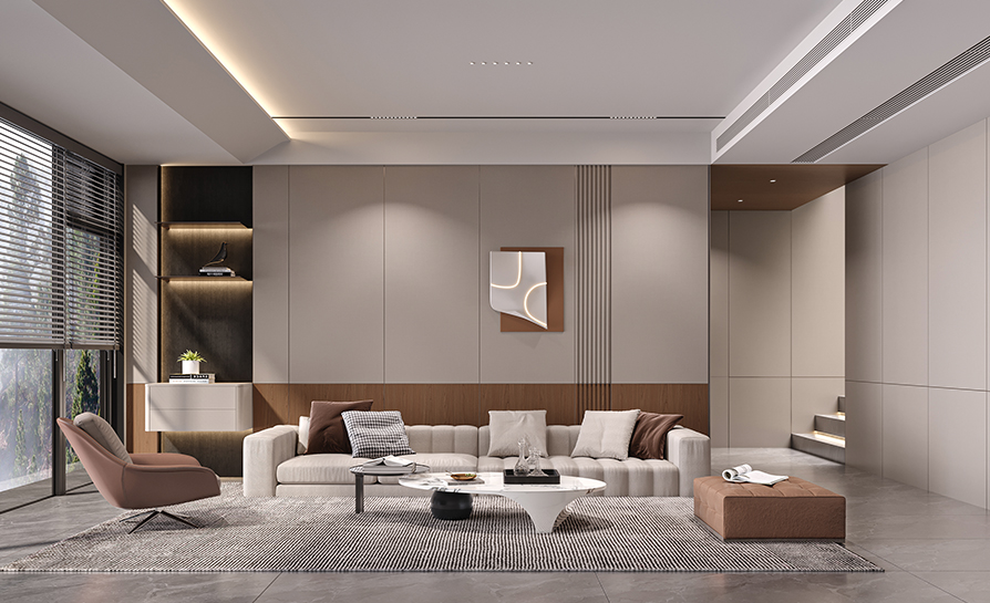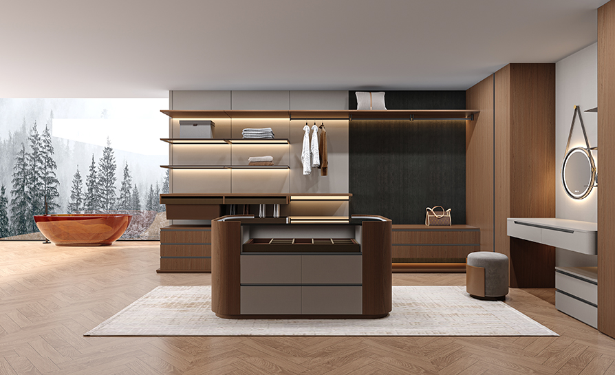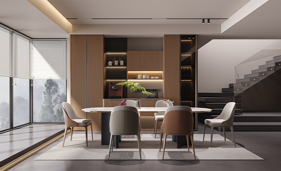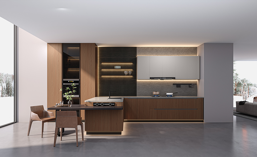 追逐自然和经典的文化意境 胡桃木纹轻舞,刻下沉稳的韵 灰调朦胧清透,和谐共叙 线性划破桎梏,简约且坚定 古铜历经岁月,在指间熠熠生辉 于此,在空间中交汇融合